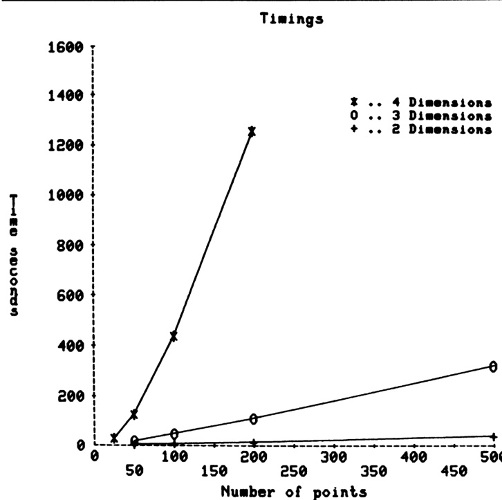 图6展示了该算法在2、3和4维空间中处理不同数量点时的运行时间。Green-Sibson算法处理相同的二维500点数据耗时5.5秒,而作者的算法耗时28秒。由于Green-Sibson算法利用了结构的二维特性,预期其速度更快;对于纯二维情形,作者毫不犹豫地推荐使用Green-Sibson算法而非自己的算法。所有运行均在巴斯大学与布里斯托大学共有的双处理器Honeywell Level 68DPS计算机上进行,操作系统为Multics。