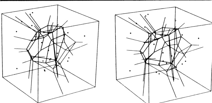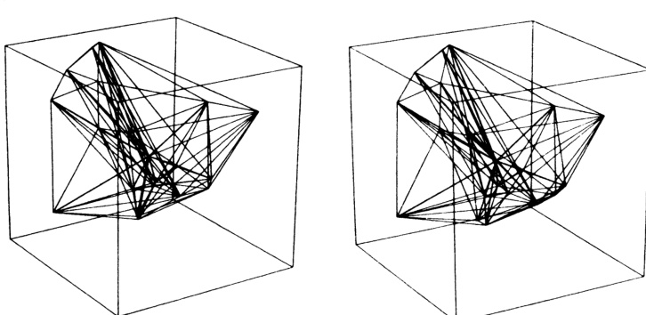 前文已给出两个二维结构的图示。计算出三维结构后,对数据点和镶嵌顶点的坐标进行处理,从某一视点生成该结构的透视图像是一件简单的事情。若将视点稍作移动并生成另一幅图像,即可得到一对立体图像。图4展示了立方体内20个点的镶嵌立体图像对。其中19个点按立方体上的均匀分布生成,第20个点置于立方体中心。第20个点及其对应区域用比结构其余部分更粗的线条绘制,以便更清晰地观察一个完整的区域。图5展示了对应的Delaunay四面体。