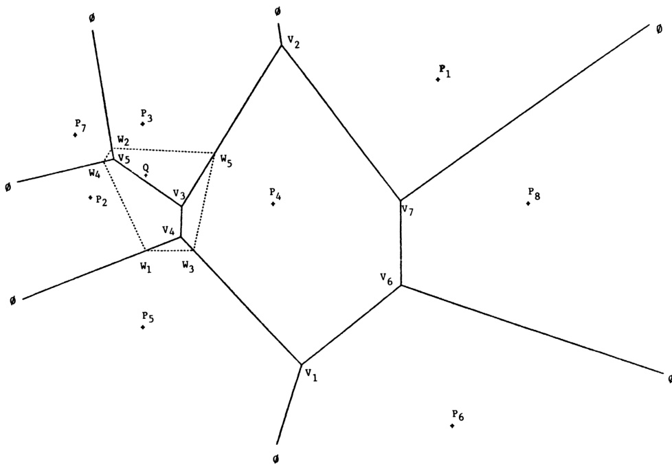 一旦找到新点的最近邻点,找到一个被删除的顶点就很简单了。新点至少会删除其最近邻点区域边界上的一个顶点。该方法的一个特点是,必须为结构中的每个点维护其相邻点列表,以便轻松执行行走操作。这些列表在算法完成后可能非常有用,且易于计算和维护(见步骤 3 和 4)。如果能直接通过表 1 中存储的顶点结构进行行走以找到被删除的顶点,从而无需维护单独的邻接列表,那就更好了。从构型质心附近的某个顶点出发,在顶点结构中行走以找到距离新点最近的顶点是很容易的。不幸的是,该顶点未必会被新点删除,作者尚未能设计出一条简单的规则来找到附近一个确实会被删除的顶点。