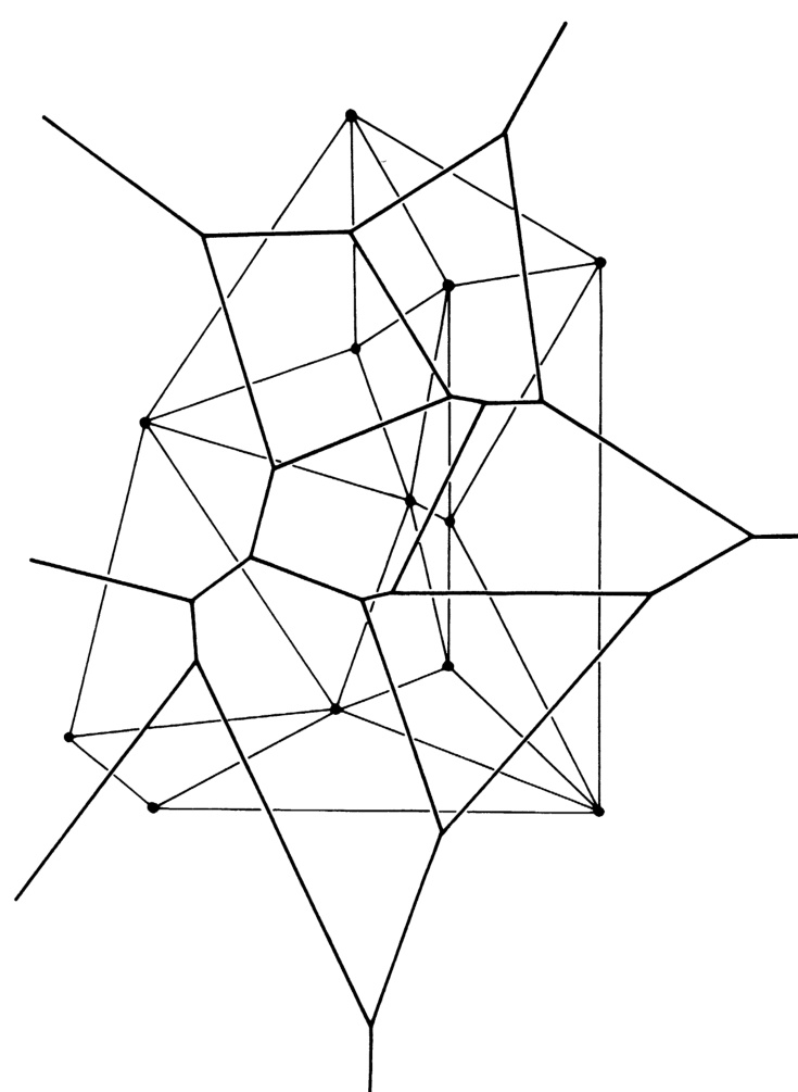 图1 小规模点集的 Dirichlet 镶嵌(粗线)与 Delaunay 三角剖分(细线),引自 Green 和 Sibson(1978)