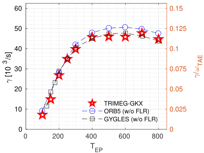 在先前工作中,为与其他代码进行基准对比,对不同 EP 温度下的 EP 驱动 TAE 进行了模拟。 为使 TRIMEG-GKK 中的模型尽可能与其他代码一致,对热离子、高能粒子和电子均采用 方案。由于我们关注线性解,因此求解线性回旋动理方程时,标记粒子沿未扰动轨迹推进,但其权重随时间演化。我们仅与 ORB5 和 GYGLES 的结果进行比较,因为它们的模型与我们的更为相似。EP 驱动 TAE 的增长率如图 4 所示。在忽略有限拉莫尔半径效应的模型下,结果吻合良好。