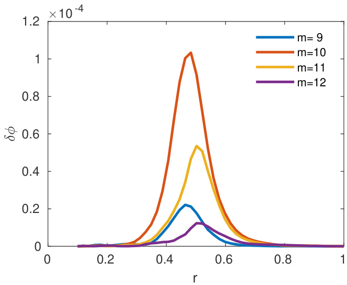 图5. 由高能粒子(EP)驱动的TAE模的极向谐波径向结构,其中高能粒子温度为 keV。图中绘制了四个主导谐波()。