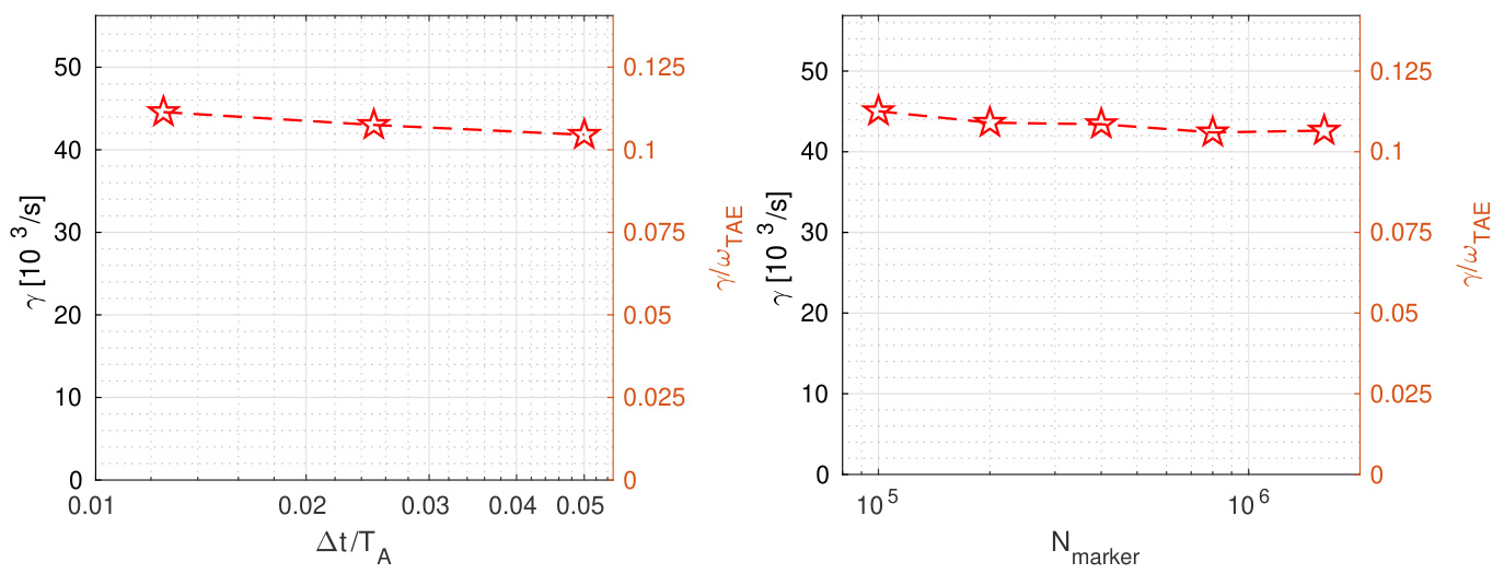 以 EP 驱动的 TAE 基准情形( keV)进行收敛性研究。首先,我们需要确定时间步长,并了解其在后续研究中的最大可接受值。本文中模拟的是 的 TAE,环向方向仅取整个环面的 。由于每个波长使用 8 个网格点已足够,因此取 。由于频率主要由非共振粒子决定,而增长率主要由共振 EP 决定,因此增长率通常需要更高的分辨率,我们仅展示增长率的收敛性。对于典型的网格规模 ,每种粒子种类选取的标记粒子数为 。不同时间步长对应的增长率如图 2 左图所示。当 时,增长率开始收敛,其中 是在 处估算的 TAE 周期,