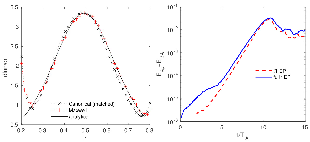与 方案结果一致。仍可观察到增长率的差异,但仅为约8%,这是由于全 与 中分布函数的细节结构及其相关的波粒相互作用可能存在差异。尽管如此,采用正则高能粒子分布被证明是一种切实可行的方法,既能避免显著的高能粒子剖面弛豫,又能在全 模拟中匹配高能粒子密度剖面。对于本ITPA-TAE案例,高能粒子密度扰动较小(), 方案仍然适用,因此适合比较全 与 方案。对于更长时间尺度的模拟以及间歇性和瞬态等离子体,高能粒子剖面可能发生更显著的变化,此时全 高能粒子方案因其能够描述相空间中任意分布及其时间演化而具有天然优势,而 方案则因 增大导致噪声水平升高而效力下降。未来工作将开展更多高能粒子分布具有显著时间演化的模拟研究。
