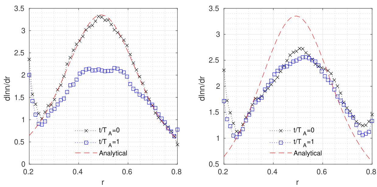 尽管采用局域麦克斯韦分布的全 模拟是一个定义明确的问题,可作为全 研究的基准案例,但更重要的是采用基于运动不变量的动理学平衡分布(即正则麦克斯韦分布),并明确正则麦克斯韦分布与局域分布模拟结果之间的差异。图7展示了采用局域麦克斯韦分布和正则麦克斯韦分布时高能粒子剖面的弛豫情况。对于局域麦克斯韦分布(左图),在 个高能粒子穿越周期内,对数高能粒子梯度减小了约40%;而对于正则分布(右图),梯度几乎保持不变(基准案例中 keV 时,)。然而,正则分布需进行调整以匹配解析径向分布,因为采用平移后的正则环向动量 描述的高能粒子分布函数实际上对应于高能粒子轨道中心的分布。