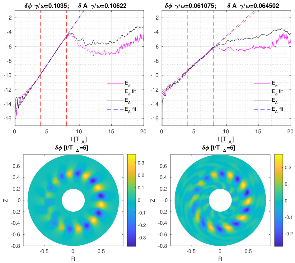 代码在电磁问题模拟方面表现出色,即使对于电子趋肤深度较小的ITPA-TAE情形,也有效缓解了抵消问题。在线性增长速率和模结构方面,本工作结果与其他代码先前的结果吻合良好。